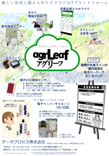 環境に配慮した省電力駆動と太陽光下でも良好な視認性を併せ持つ新しい表示デバイス「電子ペーパーサイネージ(EPS)」と「屋内CO2環境センサー」、営農支援サービスの「アグリーフIoTプラットフォーム」を組み合わせた活用事例を展示。 |