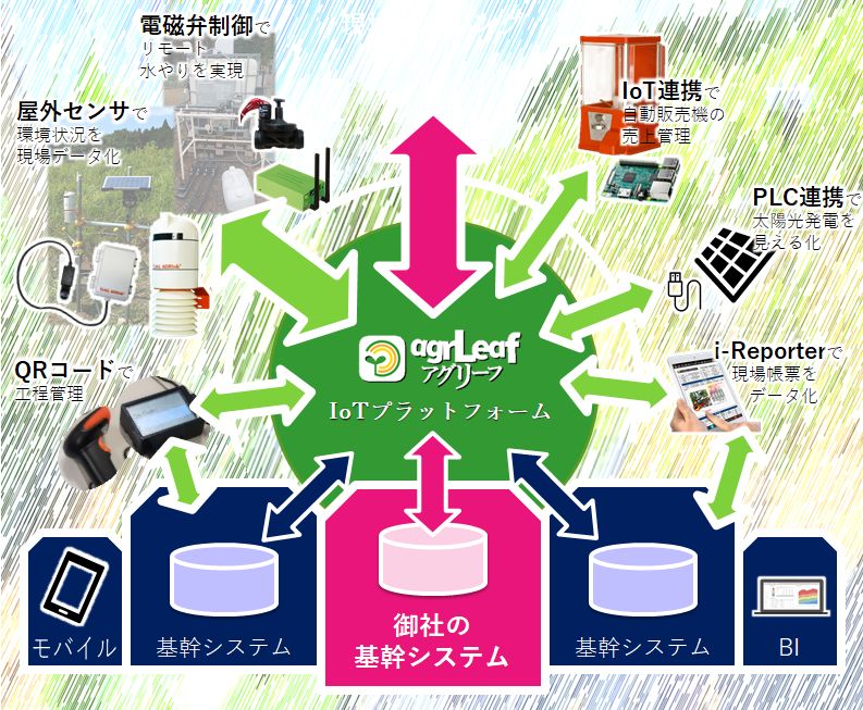 アグリーフIoTプラットフォームは、弊社の営農支援クラウドサービス「アグリーフ-agrLeaf-」をはじめ、 多くのお客様のDXプラットフォームとして、活用いただいております。